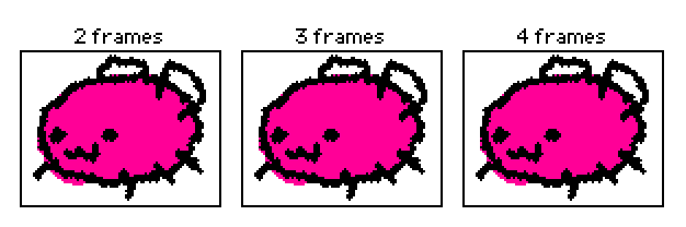 We cycle through displaying the buffers at roughly 12 frames per second- a familiar speed for limited animation- though the drawing itself is processed more responsively. Three frames is something of a sweet spot: using only two frames produces an unpleasant jittering effect, and more than three frames offer a diminishing addition of fluidity: