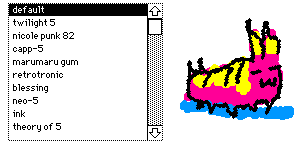 In WigglyPaint, I chose a design philosophy of strongly discretizing choices: good defaults, a few interesting options, no infinite combinatoric landscapes. Every drawing tool has a distinct personality. Instead of offering the millions of subtly varied colors available in a general-purpose drawing program, WigglyPaint offers five colors at a time- lineart, background, and three “markers”- with a range of striking, opinionated preset palettes: