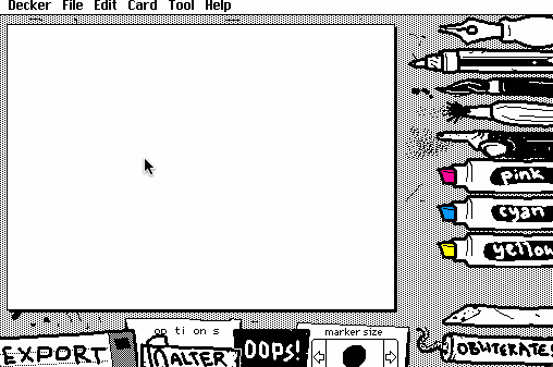 Instead of an infinite undo history, WigglyPaint has a single “Oops” button. From a technical perspective, more undo levels would be easy to furnish. No undo levels at all can be truly infuriating, especially on touch-based devices that occasionally register spurious lines. A single undo level is just enough: it encourages a sense of committing to forward momentum on a drawing.